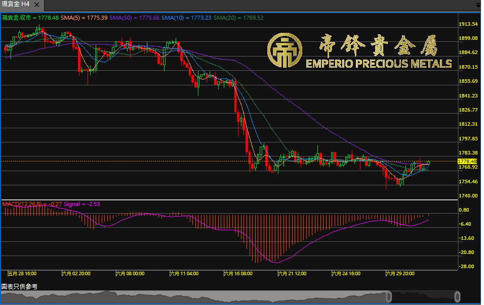 週四金價持續反彈,早段開市最低見1765,之後繼續反彈上漲,中段最高見1782,其後受阻回落,尾段再次回升。隔夜公佈的上週初請失業金人數錄得36.4萬人,較預期增加39萬人為理想,更創出超過一年新低,金價一度由1780之上回落