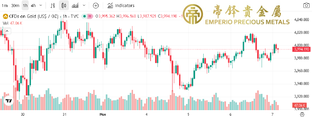 週四金價衝高回落,早段開市最低見3964,之後上漲並突破前一日高點,中段最高升至4019,但其後由高位回落,尾段一度下滑至低位附近,收市前小幅回穩。美國最高法院開始審理特朗普大規模徵收關稅的合理性,多名大法官質疑總統是否有權力對貿易夥伴徵收關稅,預計最終宣判結果將會在幾星期至幾個月公佈,如果法院裁定徵收關稅違法,可能引發新一輪不確定性,從而利好金價走勢