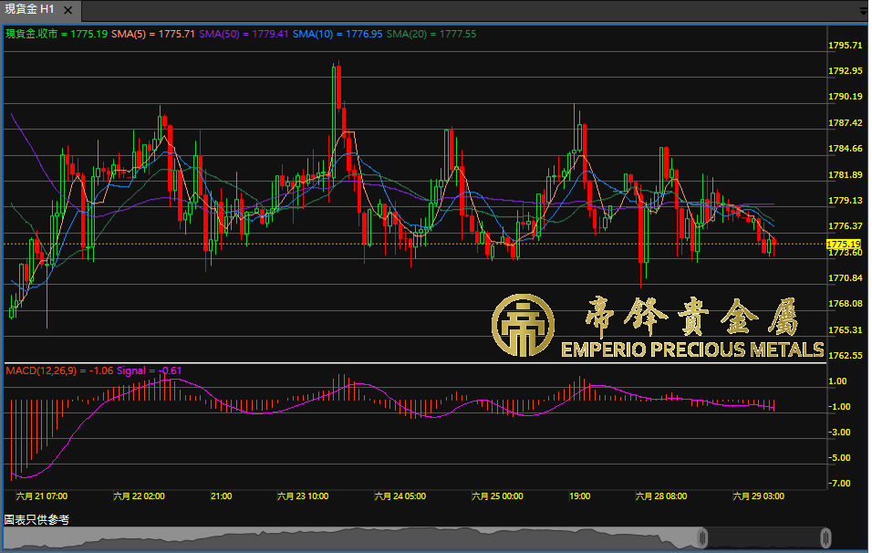 週一金價仍然保持震蕩,早段開市最低見1770,之後反彈上漲,中段最高升至1785,其後再度受阻回落,尾段持續震蕩。本週將有多項重磅數據公佈,當中以週五公佈的6月非農就業人數和失業率最為重要,相信距離金價打破震蕩為時不遠
