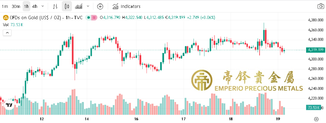 週四金價走勢反復,早段開市震蕩向下,中段最低跌至4308,之後迅速回升,尾段一度升至最高4374,距離歷史高點4381只有一步之遙,但其後由高位下挫,收市前窄幅波動。昨日公佈的11月CPI按年錄得增長2.7%,明顯較市場預測為低,同時核心CPI亦較預測低,反應通脹未有繼續升溫,金價一度逼近歷史記錄高點