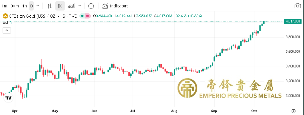 週二金價逼近4000大關,早段開市先震蕩,中段小幅回落,最低見3940,之後再度回升,尾段最高升至3990,距離4000整數關口只有一步之遙,收市前企穩高位。金價仍以驚人的速度維持上漲,並在今日早段突破在今年較早時間難以想象的4000美元,似乎升勢沒有止境,回報大幅拋離其它資產