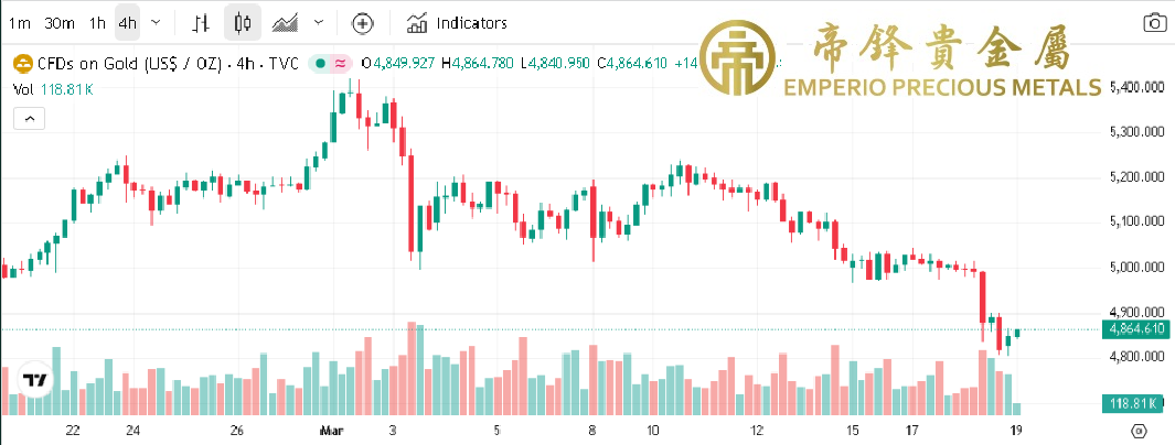 週三金價跌至近期新低,早段開市先震蕩,中段最高見5016,之後快速下挫,尾段小幅反彈,收市前再度下跌,最低跌至4806,見2月6號以來最低。今日凌晨聯儲局公佈最新議息結果,一如預期維持聯邦基金利率3.5%-3.75%不變,同時根據利率點陣圖顯示,今年大機會只會再減息一次,金價跌勢加劇