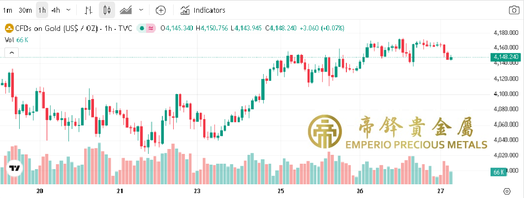 週三金價衝高回落,早段開市見全日最低4129,之後上漲並突破前一日高點,中段升至最高4173,尾段由高位下挫,但收市前再度回穩。原定昨日公佈的美國第三季度GDP以及9月PCE將再度推遲至12月公佈,今日由於美國進入感恩節假期,金市將會連續兩日提早收市,預計整體波動將會較為有限