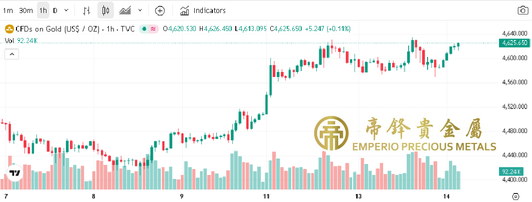 週二金價高位震蕩,早段開市震蕩整理,中段窄幅波動,尾段先上漲至最高4634,之後回落至最低4569,但收市前再度回穩。昨日公佈的12月CPI按年錄得增長2.7%,符合市場預測,而核心CPI則錄得2.6%增長,仍處於近年低位,反映通脹大致維持平穩,雖然一月減息機會不大,但聯儲局今年再減息機會仍然高,金價在歷史高位附近上落