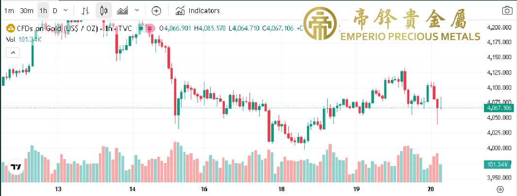 週三金價衝高回落,早段開市最低見4055,之後上漲並突破前日高點,中段最高升至4132,尾段由高位回落測試低位支撐,收市前波動收窄。今日凌晨聯儲局公佈上月議息會議紀要,紀要顯示大多數官員對於未來是否繼續減息持有較大分歧,根據利率期貨顯示,最新12月減息機率已降至不足三成,金價雖一度突破4100,但未能企穩