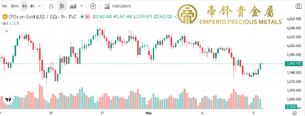 週二金價小幅下挫,早段開市見最高4004,之後下滑,中段回升至高位附近,尾段再度下挫,最低一度跌至3928,收市前低位窄幅波動。美國聯邦政府停擺已達35日,追平歷史上停擺最長時間,在缺乏官方數據之下,今日公佈的ADP重要性不言而喻,值得重點關注,金價跌至近日低位附近