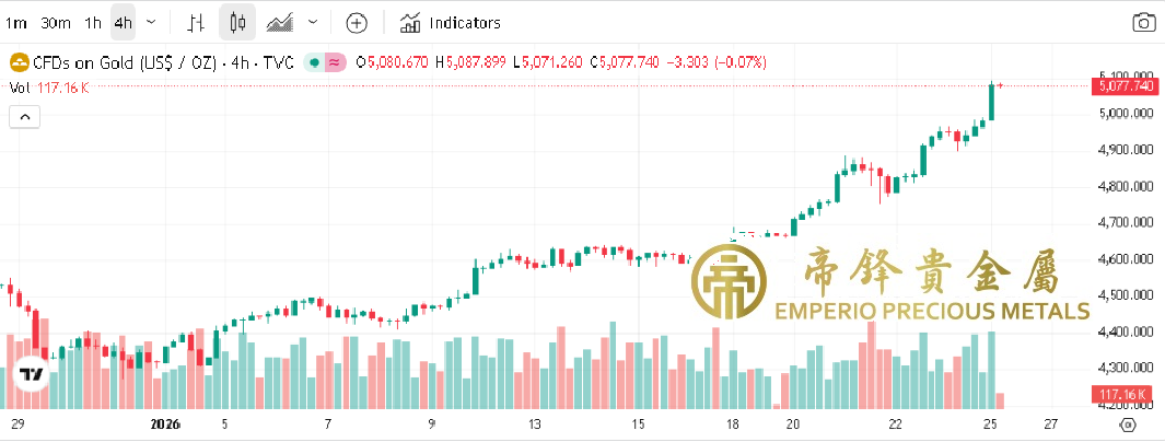 週五金價維持升勢,早段開市窄幅波動,中段下滑至最低4899,之後由低位回升,尾段再創新高,收市前最高升至4989,距離5000整數關口只有一步之遙。而今日開市金價跳空高開,成功突破5000大關,再次展現出令人驚訝的走勢,縱觀全球大行去年尾分析,普遍認為今年金價可能挑戰5000美元,但一月份尚未完結,已觸及此位置,表現相當強勢,似乎稍後金價升至任何高位已不足以令人感到意外