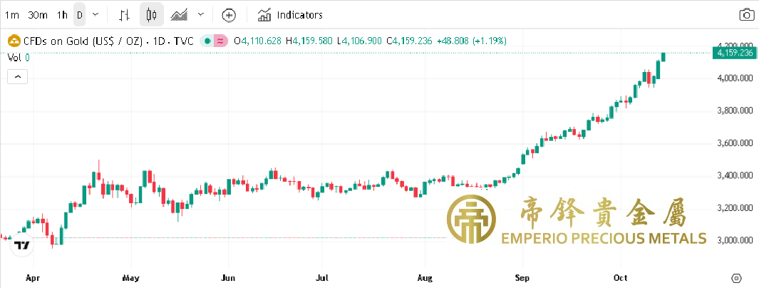 週一金價突破4100,早段開市即見全日最低4008,之後上漲並再創新高,中段持續向上攀升,尾段成功突破4100,最高見4116,收市前高位震蕩。中美貿易戰再爆發機會有所下降,但金價仍已驚人的速度繼續上漲,現時難以估計今輪升勢的終點會是哪裡