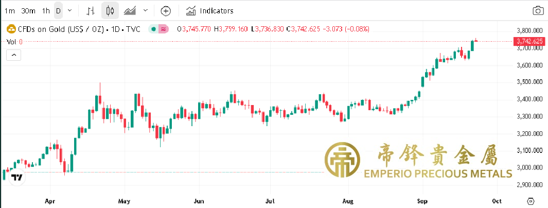 週一金價強勢突破3700,早段開市已是全日最低3683,之後稍微震蕩,中段成功突破3700,尾段升勢持續,收市前最高升至3748。對聯儲局持續減息的憧憬繼續形成對金價支撐,而經過上星期兩次失敗之後,金價終於成功突破3700整數關口