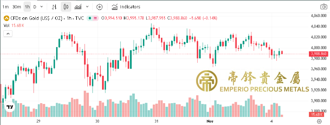 週一金價繼續震蕩,早段開市先下跌至最低3962,之後向上攀升,中段回落調整,尾段上漲至最高4030,收市前再度回落。在美國聯邦政府持續停擺之下,今個星期有多項私營機構數據值得關注,而昨日公佈的ISM製造業PMI則略低過預測,同時繼續處於50榮枯線之下,反映製造業前景並不樂觀,金價暫時缺乏方向